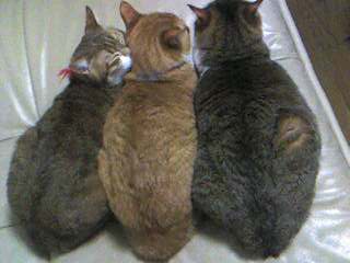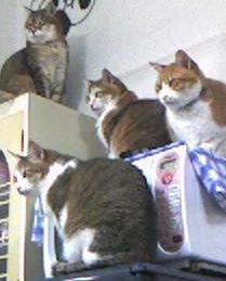 10/31/23:41 由来その2餌を与えて見回してみると水タンクが空に。 慌てて水タンクを満タンにすると 食べ終えた住民達が集合しちゃいました。 そうとうのどが渇いてたんでしょうね。ゴメンm(_ _)m しかし、珍しいので写真をパシャリ。 私の携帯が古く室内撮影には弱いので 画質が悪くなってしまいました(>_<) 写真中央で上から覗いている猫。 この猫こそが私のニックネームの1つ 『カーリング☆猫』の由来です。 名前はヒロ。 子猫の頃、フローリングの上で寝転がっているところを 歩くのに邪魔だったので滑らせてどけたら それが気持ち良かったのか足元で寝転んで滑らすのを催促してくるように。 その様子がカーリングに似ていたので猫カーリングと名付けました。 それからは趣味の話や猫の話が出るたびに猫カーリングを紹介。 このブログにカーリングの様子を撮影したファイルをUPしたかったのですが ファイル形式が対応できなかったので残念ながら。 ご覧になりたい方は一言頂ければいつでもお見せいたしますので。 長年猫達を視ていると個性の強い者もいまして。 また機会があったら紹介していきます(*^_^*)